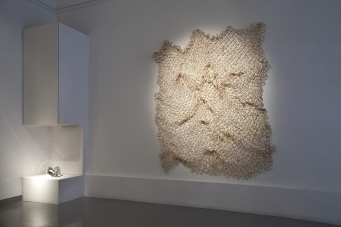 Le composizioni fotografiche dell’artista peruviana Cecilia Paredes scaturiscono da performance che ella stessa mette in scena, creando una fusione del proprio essere con il paesaggio che plasma. Le opere installative sono il compimento del suo racconto poetico: la Paredes tesse manti di conchiglie sezionate che fissa sui muri o sospende creando movimenti ondulatori che rievocano i moti delle onde del mare. Mitili, crisalidi, ramoscelli, spine e nidi ormai abbandonati sono il materiale con cui l’artista costruisce le sue opere.